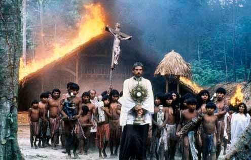 A Missão se posiciona como um “filme denúncia”, assumindo certas posições extremas, como tratar os jesuítas sendo os heróis – não vemos ninguém ruim no lado deles – e os colonizadores sendo os vilões – não vimos ninguém bom no lado deles. E até a Igreja Católica, que não tomou uma decisão feliz ao “lavar as mãos” em relação ao conflito, também é poupada. Mas como o foco seria a situação dos índios, principalmente, o massacre que ocorreu com eles, o filme optou por não se por com um olhar isento, mas para se colocar assim, teve aqui uma engenhosa manobra narrativa, quando vemos que tudo é contado por um dos personagens. Tudo ali está sendo visto com um olhar bem específico de alguém que participou de tudo e que reprova tudo que aconteceu ali. Tanto que a primeira e a última imagem do filme é justamente o olhar de reprovação desse personagem para com a história. Só que se por um lado a situação dos índios era o foco, por outro lado, os mesmos índios não demonstraram muita empatia na tela. O diretor Rolland Joffé resolveu não usar atores profissionais para interpretá-los. Como era o realismo que ele buscava, então aqui foi usado uma tribo de verdade – os Waunana, do sudoeste da Colômbia – para interpretarem os índios guaranis. Assim não temos um personagem dentre eles que chame maior atenção. Tem uma tentativa com um pequeno índio que segue o Robert De Niro, e um outro que comanda a tribo, mas pouco se consegue nesse sentido. No geral, se tem a impressão que os índios são “parte do cenário”. Isso acabou se voltando a favor do filme, já que como disse, o foco era a situação dos índios e situação deles era essa na época: Eles não tinham importância, e sim essa disputa que acontecia em nome deles e das suas terras.
